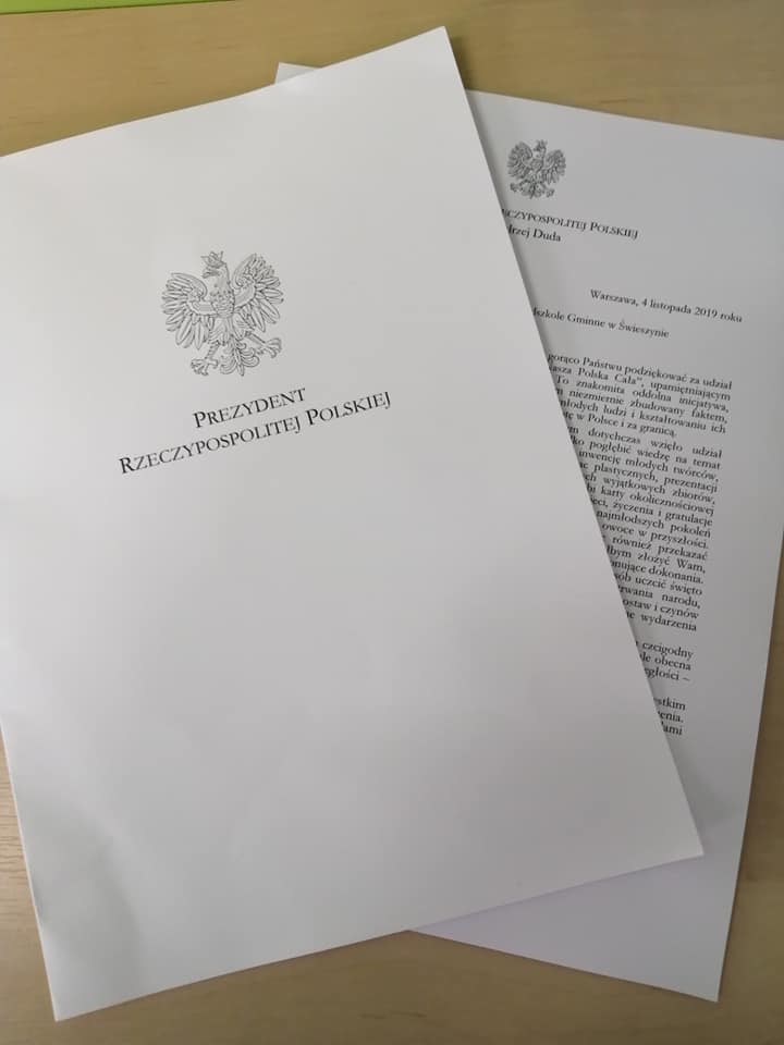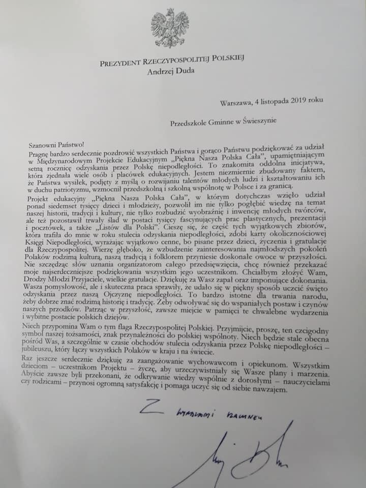 W związku z udziałem w projekcie nasze przedszkole na początku listopada 2019 r. otrzymało list od Prezydenta Rzeczypospolitej Polskiej, Pana Andrzeja Dudy, który podziękował w nim za wykonanie tylu różnych zadań i gratulował pomysłowości oraz włożonego nakładu pracy.