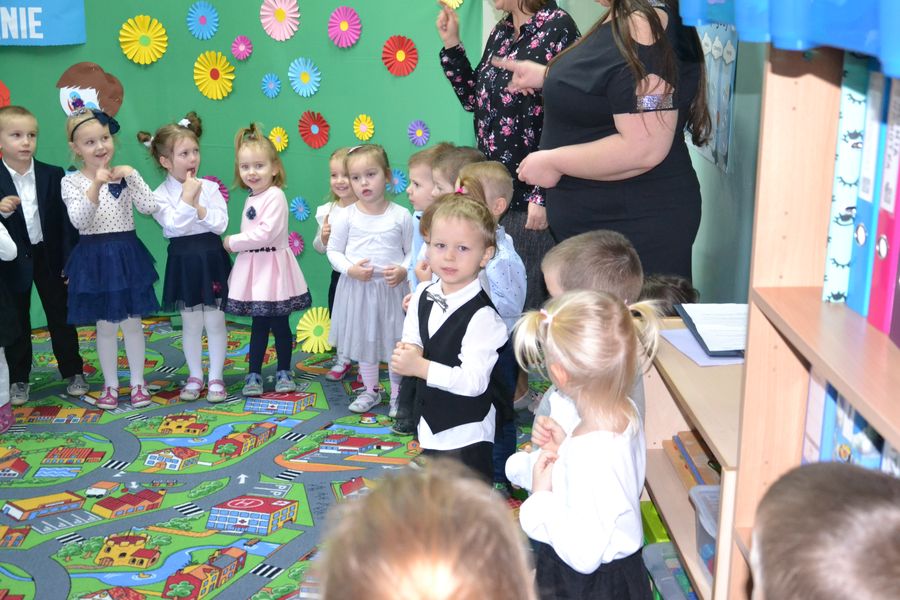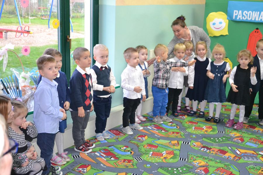 Przedszkolaki wraz ze swoimi nauczycielkami – Panią Agnieszką Żmuda i Panią Marzeną Piejko przygotowały i zaprezentowały występ artystyczny, w którym śpiewały, tańczyły oraz recytowały wierszyki. Po części artystycznej nastąpiło oficjalne pasowanie na przedszkolaka, którego dokonała naszą magiczną kredką Pani Ewa Korczak – Wójt Gminy Świeszyno. Następnie dzieci otrzymały dyplomy z rąk Dyrektor Przedszkola – Pani Sylwii Pazery. Nie obyło się bez prezentów od Rady Rodziców. Przedszkolaki od zaproszonych gości otrzymały piękne upominki i słodkości.