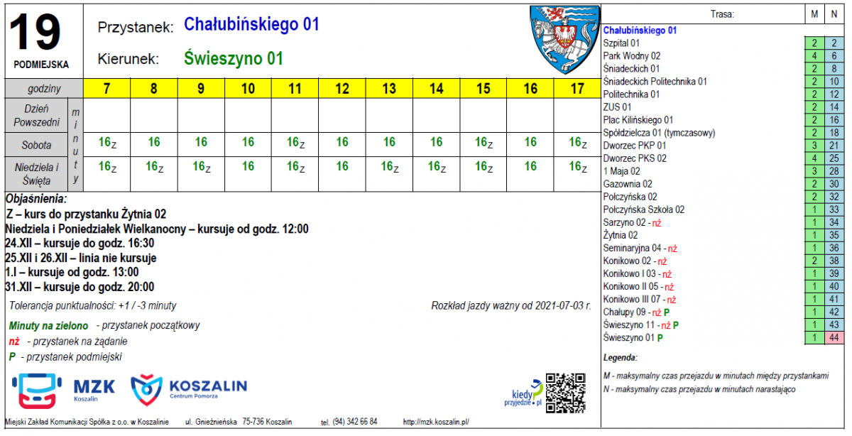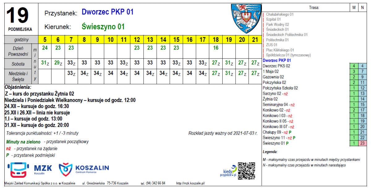 Na podstawie Porozumienia międzygminnego Prezydenta Miasta Koszalina w sprawie powierzenia przez Gminę Świeszyno Miastu Koszalin wykonywania zadań w zakresie lokalnego transportu zbiorowego, Zarząd Dróg i Transportu w Koszalinie informuje, że od dnia 3 lipca 2021 roku zostanie wprowadzony zmodyfikowany rozkład linii nr 19 zakładający: